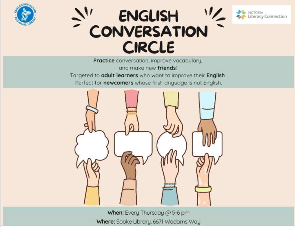 Vancouver Island Regional Library’s branch in Sooke is hosting free English Conversation Groups on Thursdays from 5-6pm facilitated by Victoria Literacy Connection.