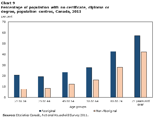 - Between 40 and 50% of Indigenous people age 65 to 74 have no certificate, diploma, or degree (Stats Canada, Aboriginal Peoples Survey, 2012)