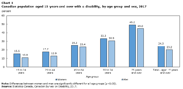 - This report, in addition to other Canadian Surveys on Disability, reveals that many disabilities co-occur with other types of disabilities. 35.1% of seniors 65 to 74 had 4 or more disabilities compared to 44.2% of their older counterpart.