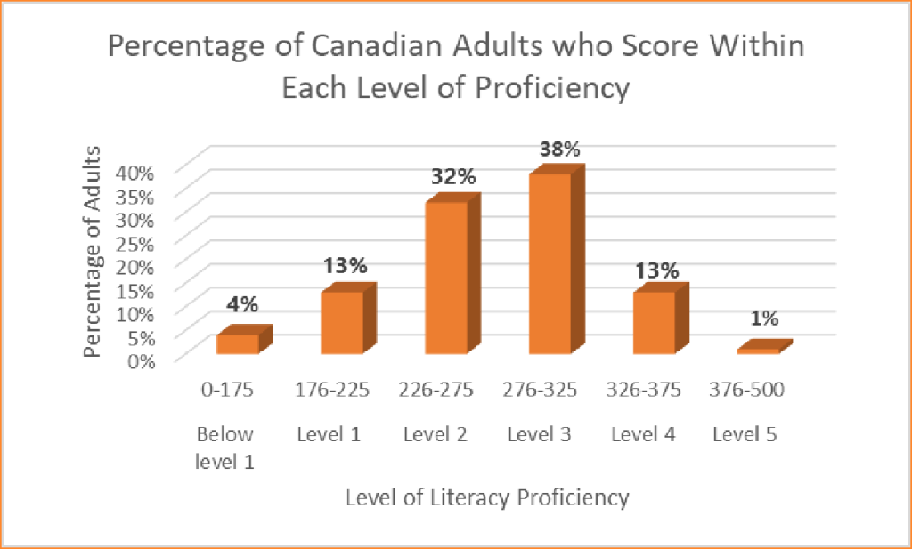 - 4% of Canadians score below level 1 and can only interpret brief written texts on familiar topics to locate a single piece of information.