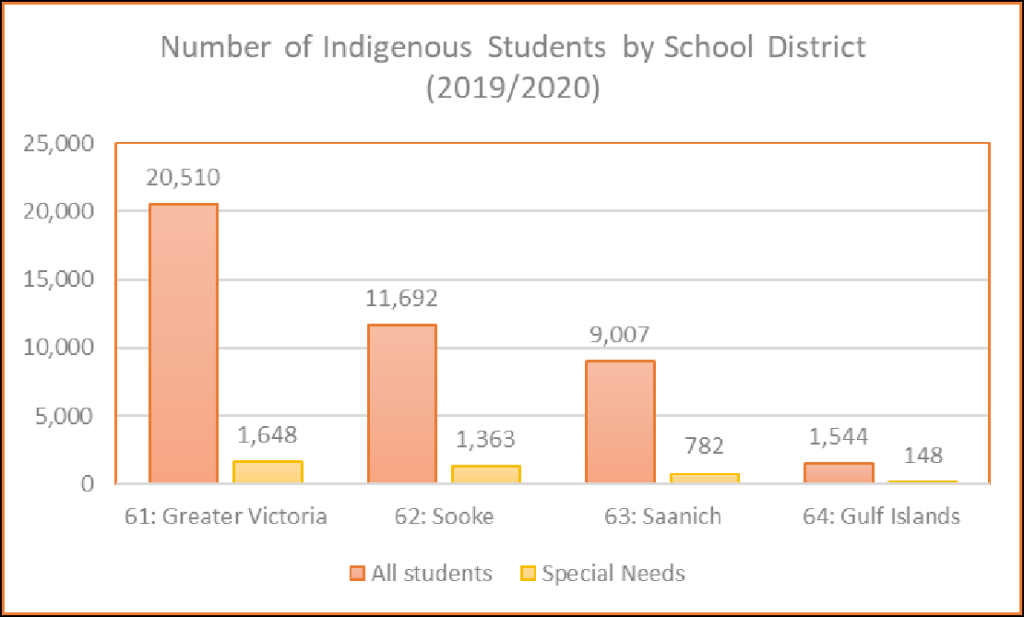 - There are 3,941 students from kindergarten to grade 12 who identified as Indigenous in the 2019-2020 school year for School Districts 61 (Greater Victoria ,62 (Sooke), 63 (Saanich) and 64 (The Gulf Islands).