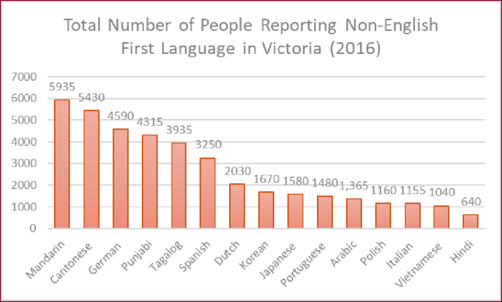 - The bar graph on the left shows the languages with the greatest number of speakers living in the Victoria Metropolitan Area in 2016. Please note that there are many more languages with fewer speakers than shown here