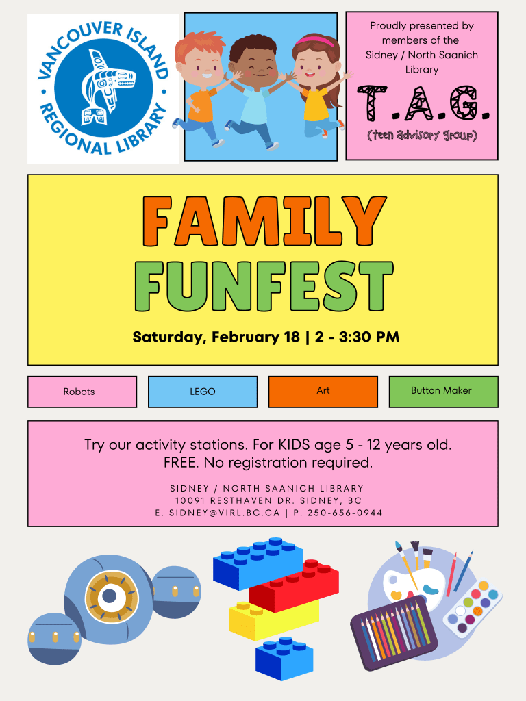 Proudly presented by members of the Sidney / North Saanich Library Teen Advisory Group (TAG). Join us for an afternoon of FREE family fun at the library (10091 Resthaven Dr., Sidney, BC). Best for kids 5 – 12 years old but everyone is welcome. No registration required.