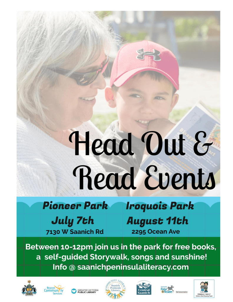Between 10-12pm, join us in the park for free books, a self-guided Storywalk, songs and sunshine! For more info, send us a message at info@saanichpeninsulaliteracy.com